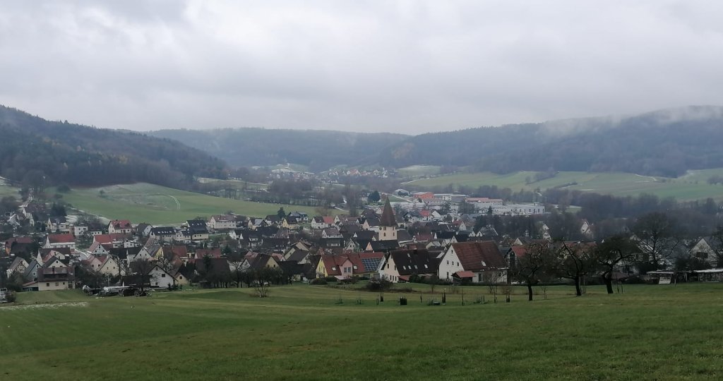 Start der Wanderung am Parkplatz an der Abzweigung nach Schrotsdorf. Von dort hinauf auf die gegenüberliegende Hangseite und auf dem Flurbereinigungsweg auf halber Höhe vorbei an Offenhausen bis nach Breitenbrunn. Leider hat das nasskalte Wetter, mit tiefhängenden Wolken keine besondere Aussicht auf das weite Tal erlaubt.