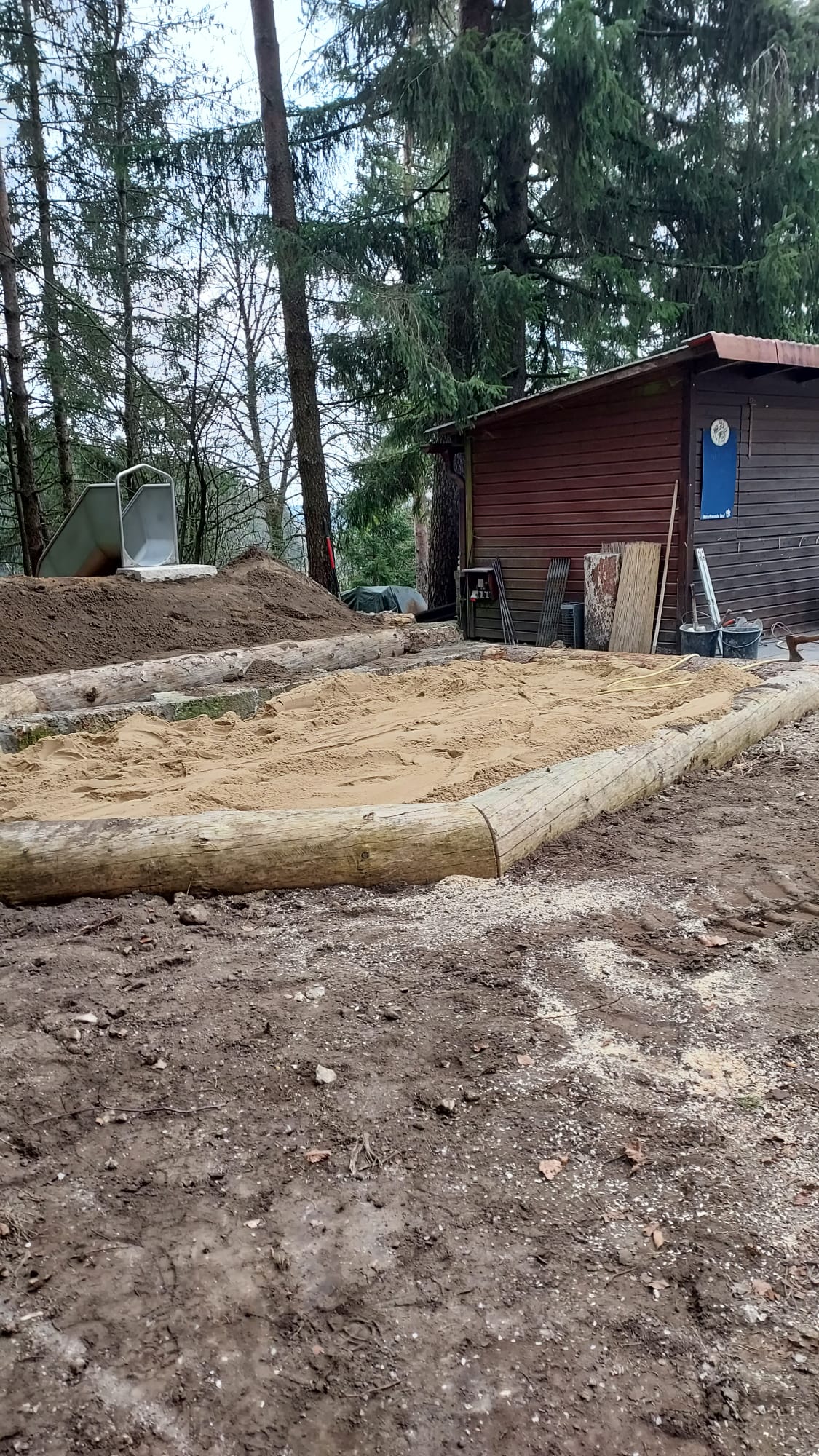 Es fehlt nur noch der Fallschutz an den Rohren, dann können wir die Tunnelröhre und die Hangrutsche für die Kinder frei geben. Ein ansehnlicher Sandspielbereich steht ebenfalls zur Verfügung.